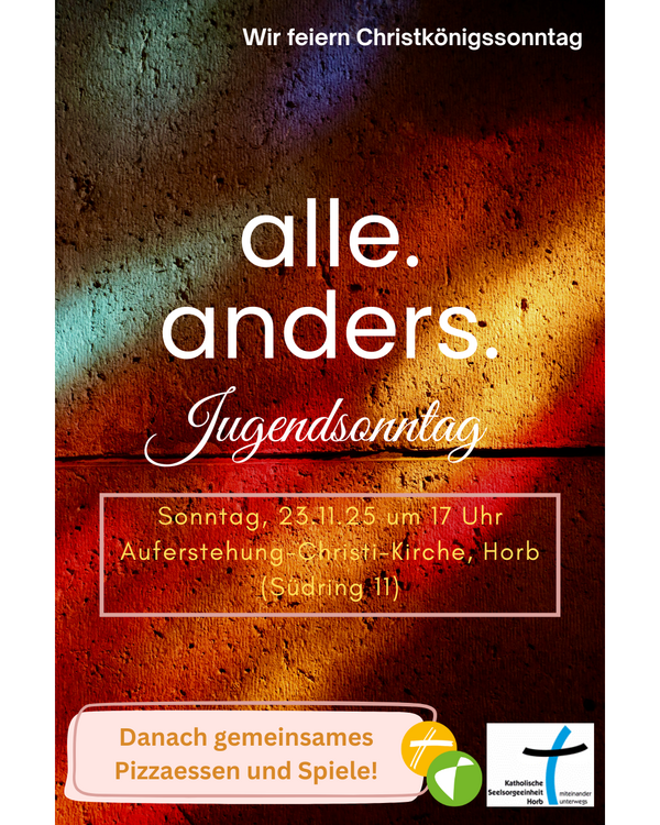 Wir möchten gemeinsam mit den Jugendlichen und jungen Erwachsenen feiert und den Glauben spürbar machen. Dazu laden wir herzlich ein, am Sonntag, 23.11.25 um 17 Uhr in die Auferstehung-Christi-Kirche in Horb. Danach wollen wir den Abend im Gemeindezentrum mit Pizza und Spielen. In der ganzen Diözese Rottenburg- Stuttgart wir der Jugendsonntag am Fest Christkönig gefeiert.